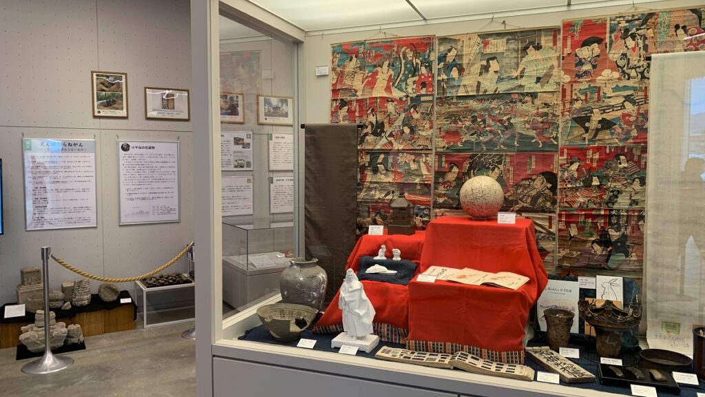 その後ろ、タペストリーのように壁に吊るされているのは、何と浮世絵です。現代人の目で見ると「えっ、日本が世界に誇る芸術作品なのにもったいない!」と声が出そうになりますが、学芸員によればこれは絵紙(えがみ)と呼ばれる地元文化。小千谷縮の商人が江戸などから持ち帰った浮世絵をつなぎ合わせて、ひな祭りなどの飾りとして使われたそうです。小千谷らしさが詰まった展示ケースは、眺めるだけで心が温まります。