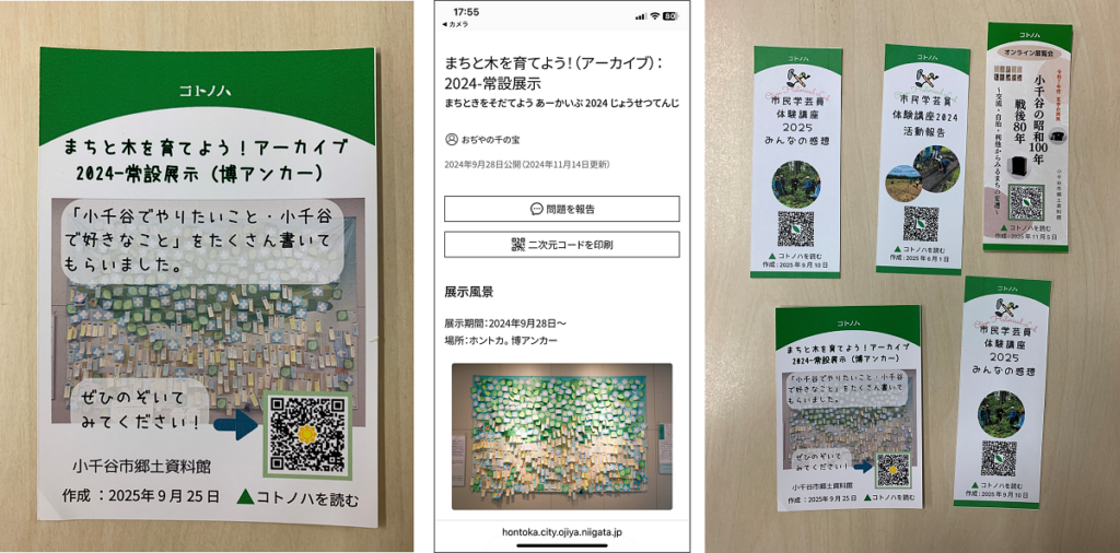 コトノハは、「ホントカ。」が展開する市民デジタルアーカイブ。今回のワークショップは、コトノハを街なかに活用する試みでしたが、これは「インターネット上で閲覧できる場」であるデジタルミュージアムの枠組みを拡張する可能性を示唆しています。「ホントカ。」を中核施設として、どこからでもアクセスでき、誰でも閲覧できるデジタルデータの利活用を促す紙のカード。市内のさまざまな立場の人々が参画できる共創型のデジタルアーカイブを、手触り感のあるアナログなアイテムを介して実現している点も小粋です。