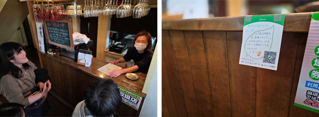 誰もが発信できるツールを使って作る、地元の方々の「とっておき情報」のデータベース。これだけでも価値ある情報源になるのですが、今回のワークショップではさらに一歩進みました。お店を紹介する内容が書かれたコトノハを、市内で営業中の実際のお店に役立ててもらおうというのです。
