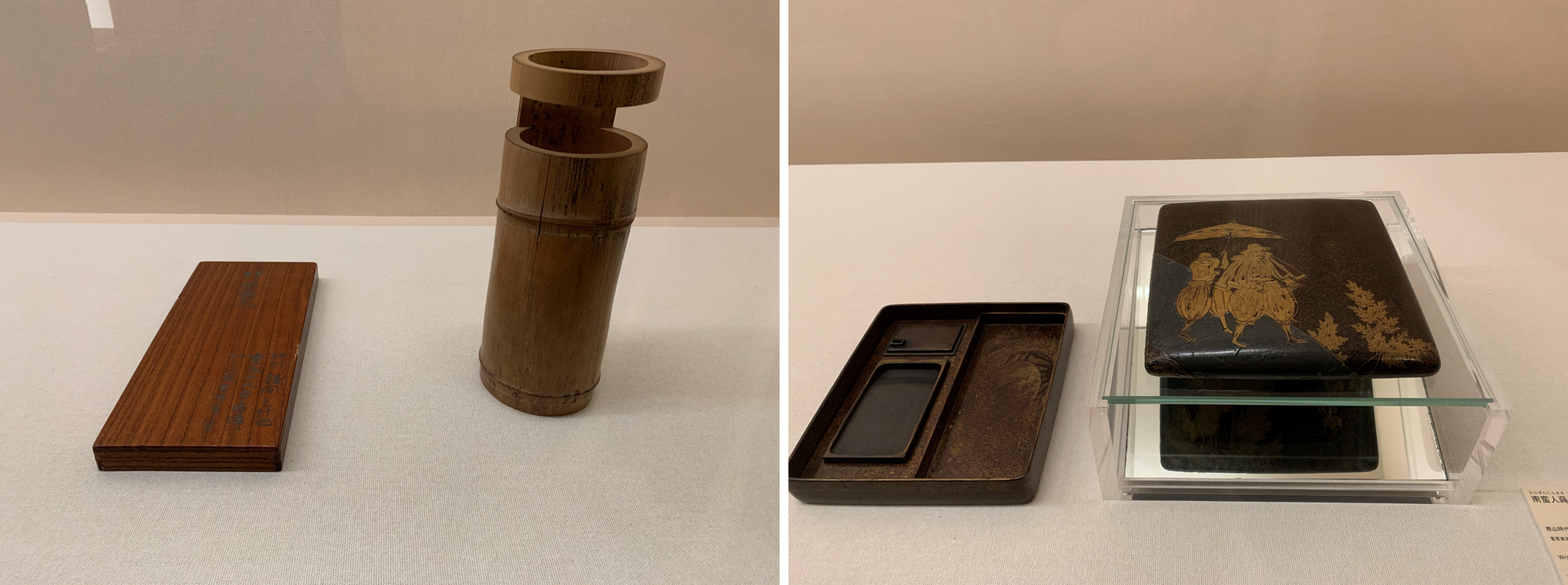 続いての写真。左は竹の花入れで、右の蒔絵の硯箱。こちらも、茶道具とのこと…ん? 硯箱? 書の道具がなぜ茶の道具として扱われているのでしょう? 一般的に、広間の茶室には書院が備わっています。書院とは元々、書を読んだり書いたりする場所なので、茶会ではそこに文房具を飾ることが多く見られます。また、一首ひらめいた時にすぐに書けるように、茶会に硯箱が必需品だったのですね。