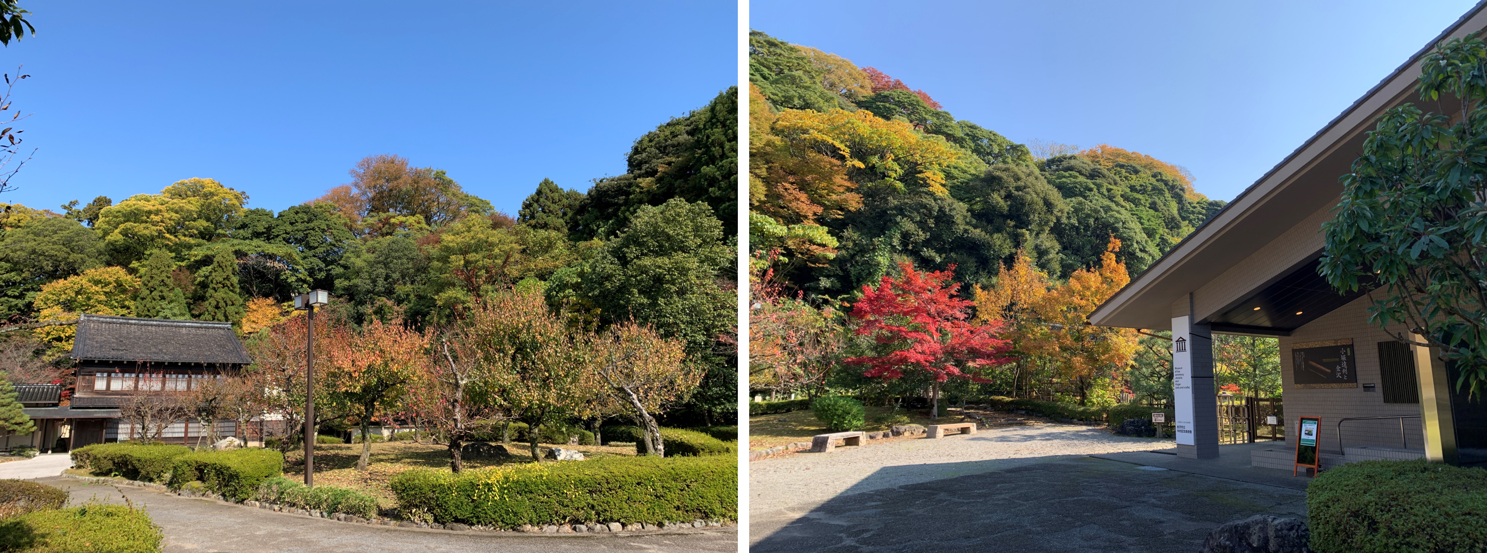 ゆったりと焼き物を眺める贅沢。知的な満腹感とともに外に出ると、この風景。いかがですか、この落ち着いた佇まい、美しく色づく豊かな森。